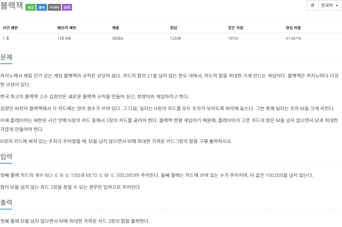 문제 카지노에서 제일 인기 있는 게임 블랙잭의 규칙은 상당히 쉽다. 카드의 합이 21을 넘지 않는 한도 내에서, 카드의 합을 최대한 크게 만드는 게임이다. 블랙잭은 카지노마다 다양한 규정이 ��