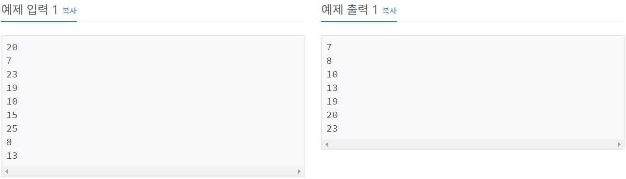 아홉 개의 줄에 걸쳐 난쟁이들의 키가 주어진다. 주어지는 키는 100을 넘지 않는 자연수이며, 아홉 난쟁이의 키는 모두 다르며, 가능한 정답이 여러 가지인 경우에는 아무거나 출력한다.