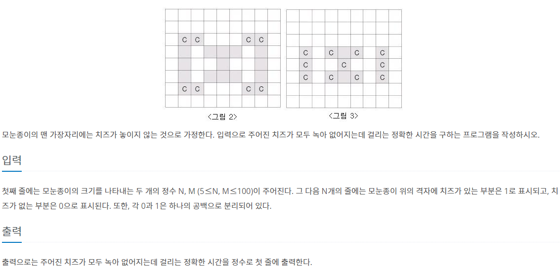 첫째 줄에는 모눈종이의 크기를 나타내는 두 개의 정수 N, M (5≤N, M≤100)이 주어진다. 그 다음 N개의 줄에는 모눈종이 위의 격자에 치즈가 있는 부분은 1로 표시되고, 치즈가 없는 부분은 0으로 표