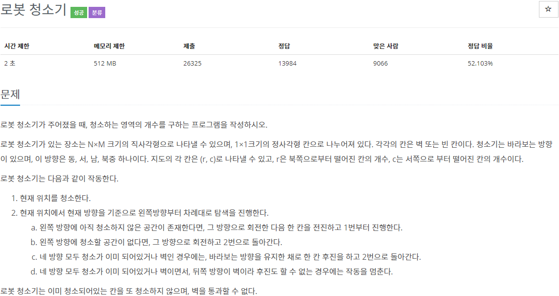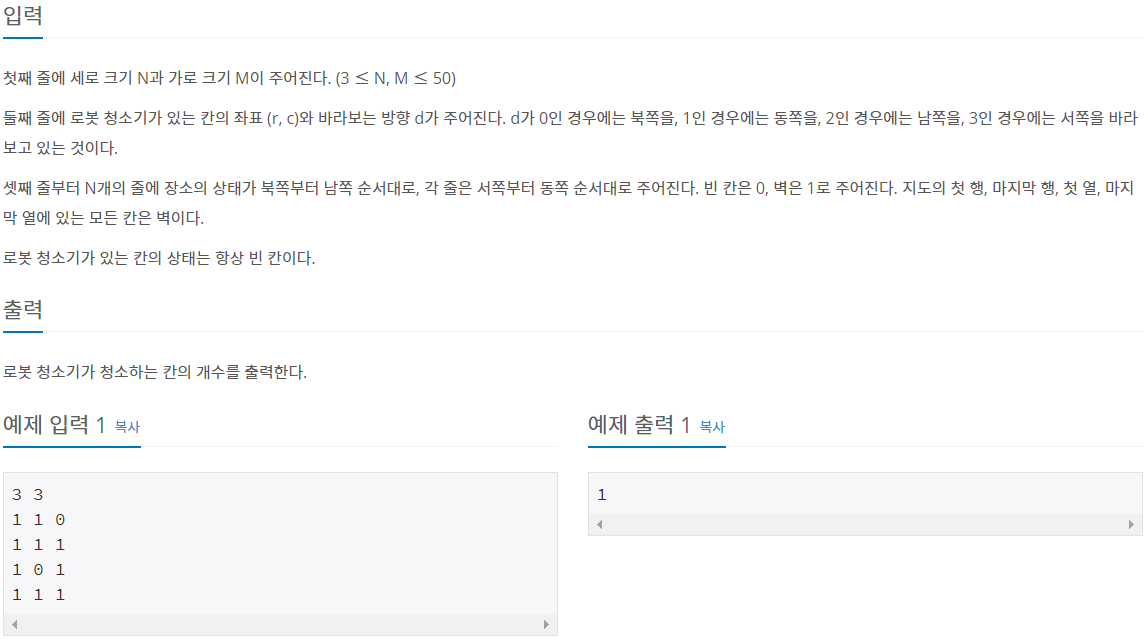 로봇 청소기가 주어졌을 때, 청소하는 영역의 개수를 구하는 프로그램을 작성하시오. 로봇 청소기가 있는 장소는 N×M 크기의 직사각형으로 나타낼 수 있으며, 1×1크기의 정사각형 칸으로 나누어