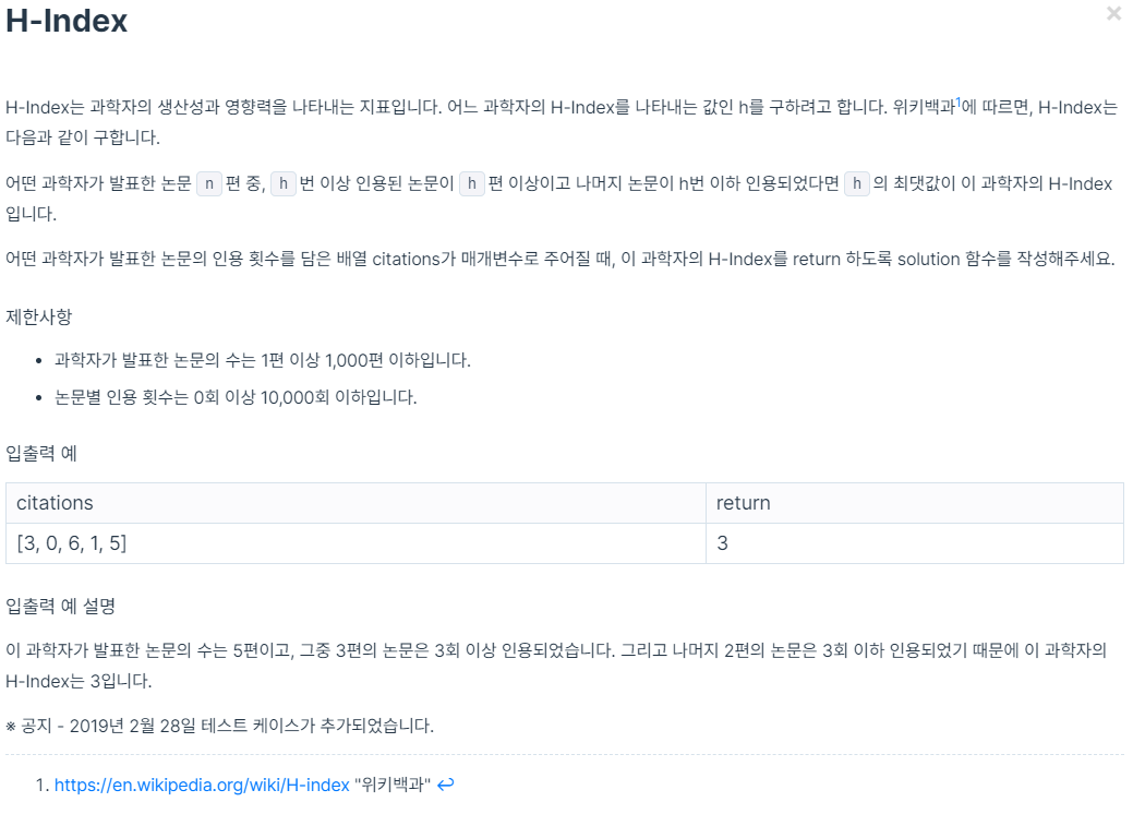 H-Index는 과학자의 생산성과 영향력을 나타내는 지표입니다. 어느 과학자의 H-Index를 나타내는 값인 h를 구하려고 합니다. 위키백과1에 따르면, H-Index는 다음과 같이 구합니다. 어떤 과학자가 발표