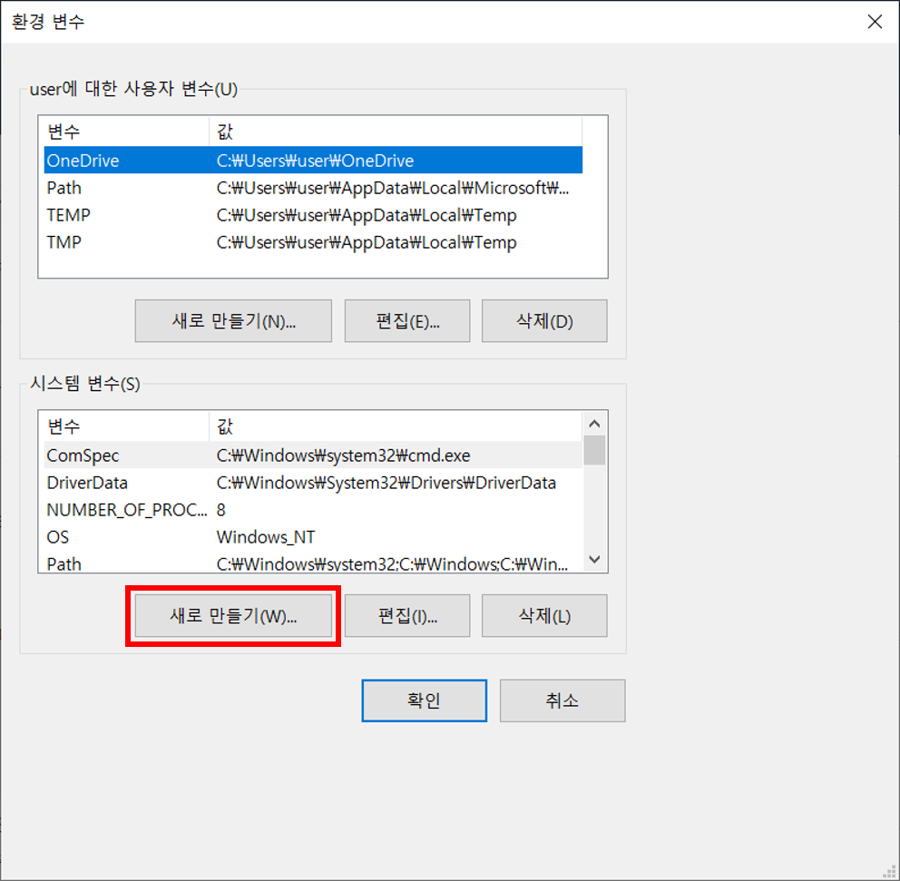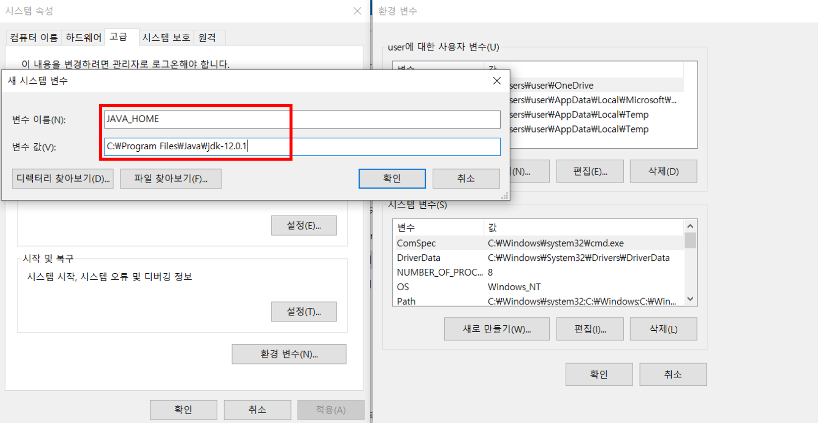 변수 값에는 자바 설치 경로를 입력한 뒤 확인을 누른다.