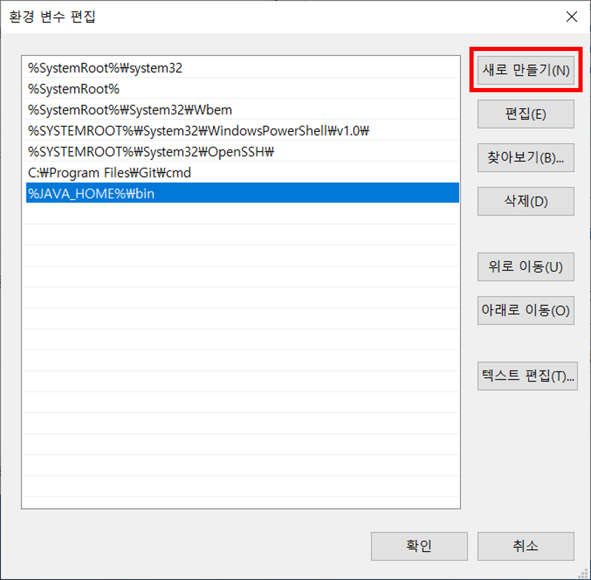 %JAVA_HOME%\bin 을 입력하고 확인을 클릭한다.