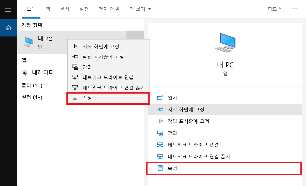 1. 윈도우키를 누른 다음 내 PC에서 우클릭 뒤 속성으로 들어간다.