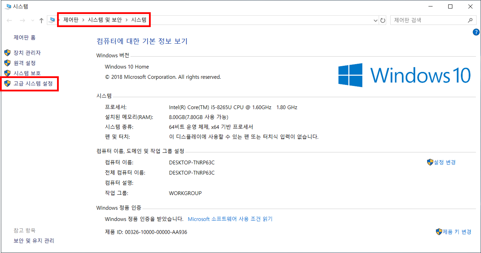 2. 제어판 > 시스템 및 보안 > 시스템을 들어간 뒤, 고급 시스템 설정을 클릭한다.