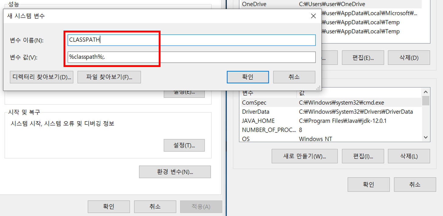 변수 값에는 %classpath%;. 를 입력한 뒤 확인을 누른다.