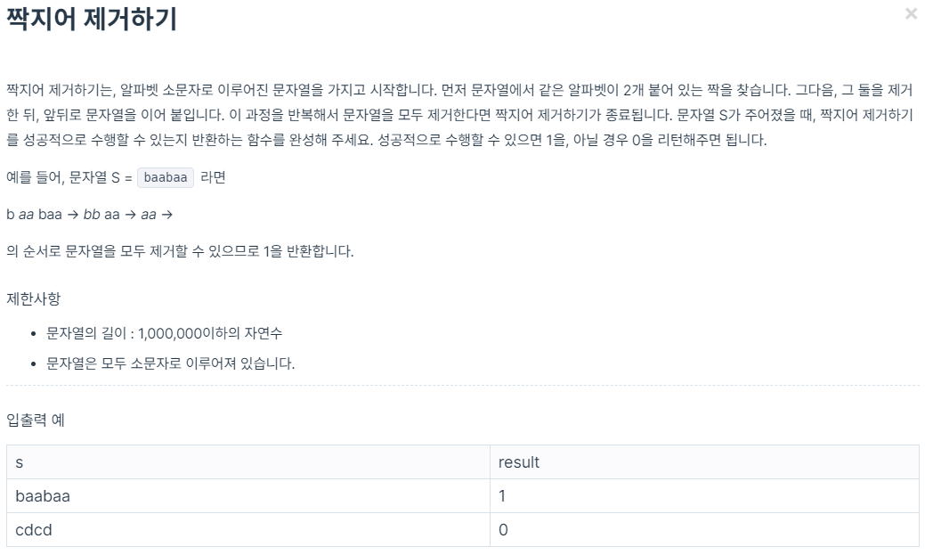코딩테스트 연습 - 짝지어 제거하기
