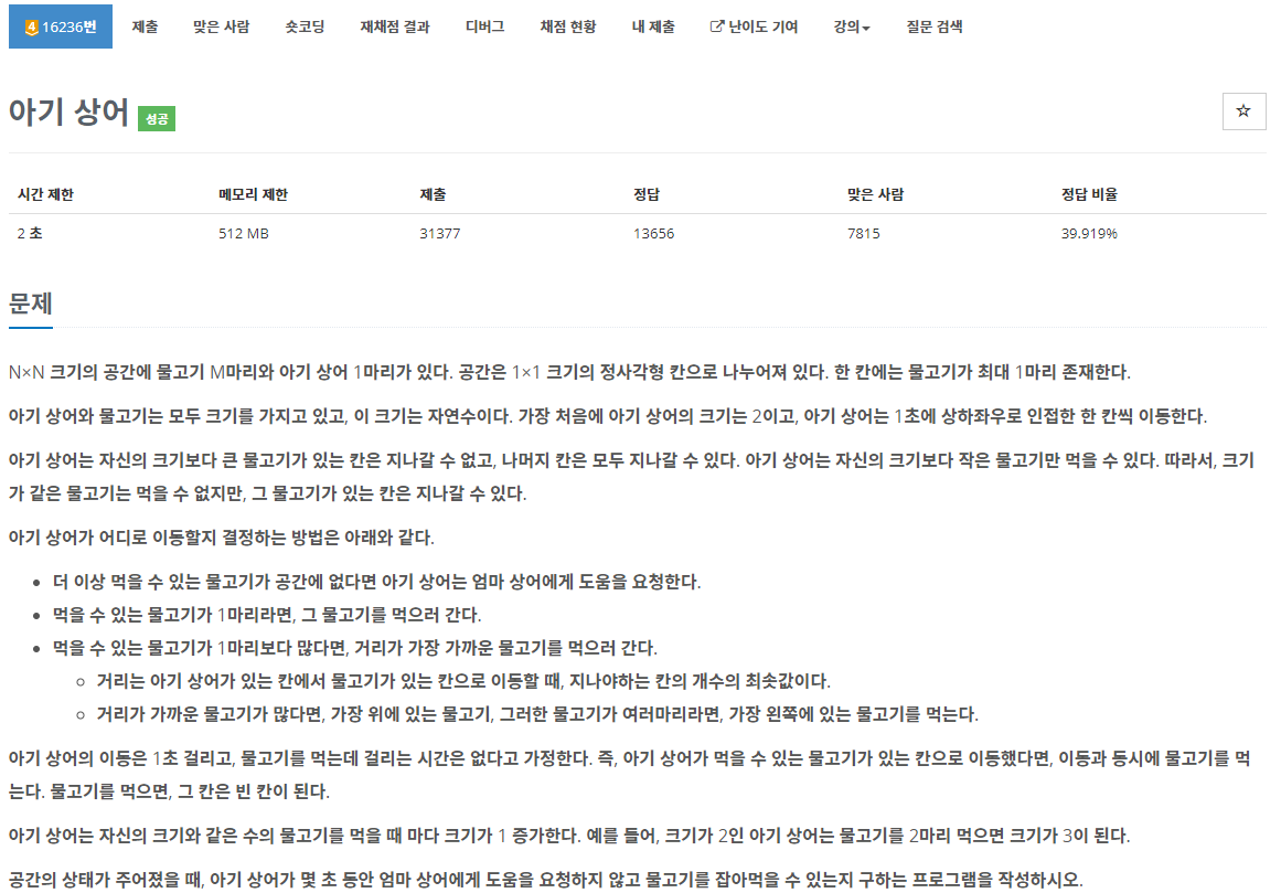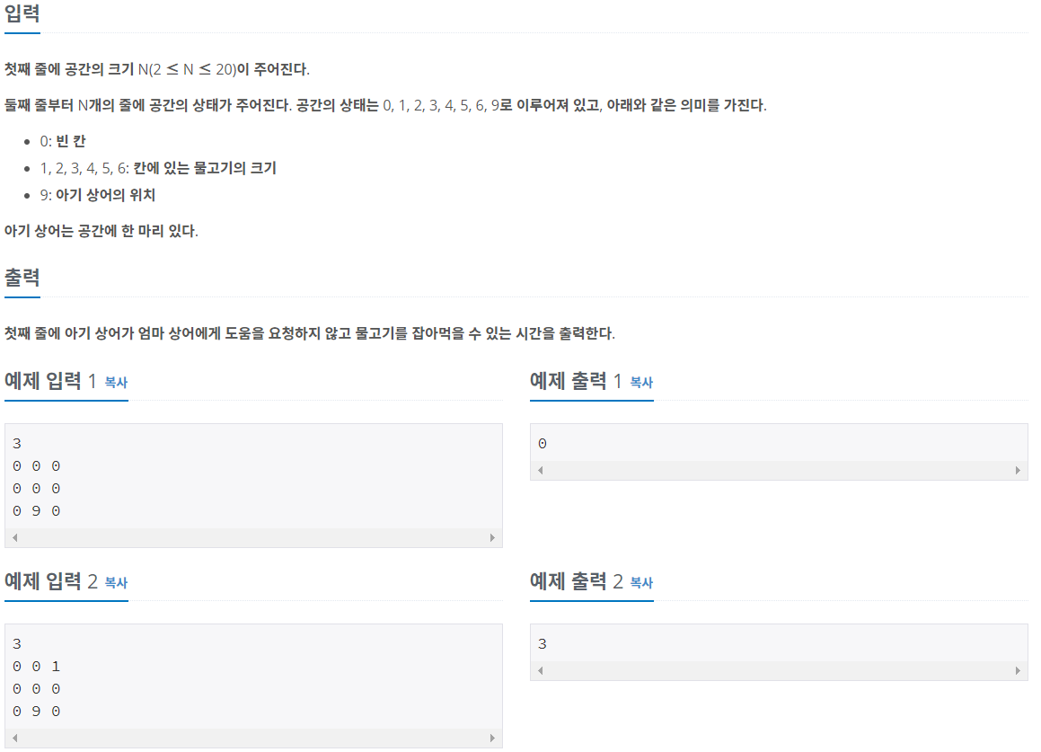 N×N 크기의 공간에 물고기 M마리와 아기 상어 1마리가 있다. 공간은 1×1 크기의 정사각형 칸으로 나누어져 있다. 한 칸에는 물고기가 최대 1마리 존재한다. 아기 상어와 물고기는 모두 크기를 가