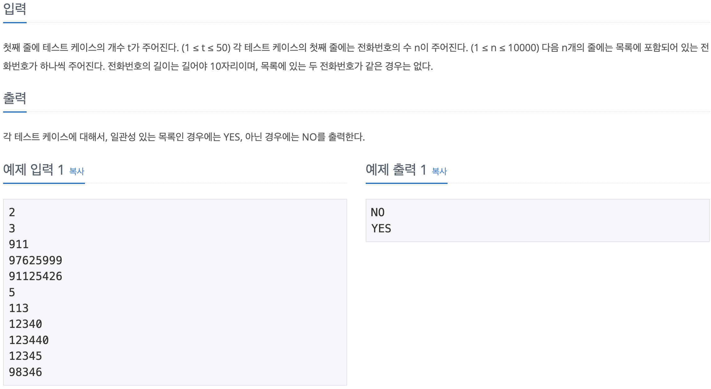 첫째 줄에 테스트 케이스의 개수 t가 주어진다. (1 ≤ t ≤ 50) 각 테스트 케이스의 첫째 줄에는 전화번호의 수 n이 주어진다. (1 ≤ n ≤ 10000) 다음 n개의 줄에는 목록에 포함되어 있는 전화번호가